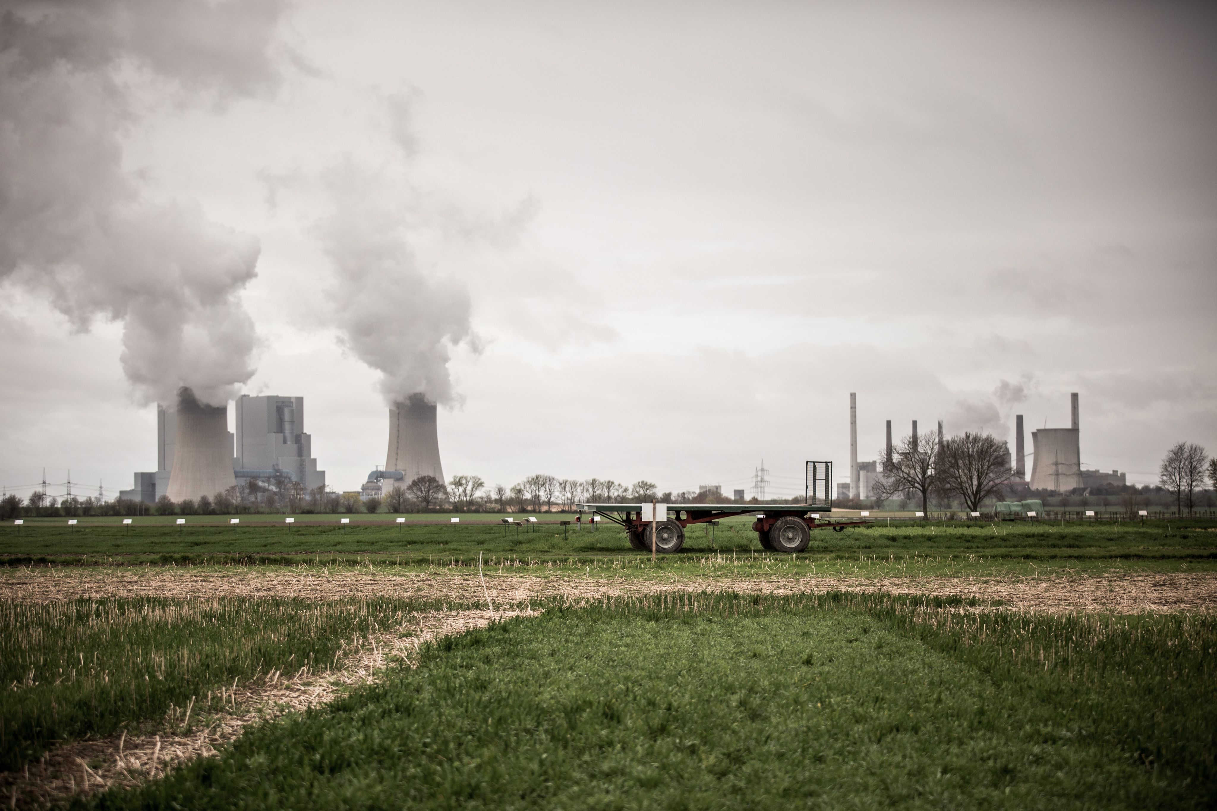 Power lines cross the fields, on the horizon the cooling towers of the Neurath coal-fired power station pump steam into the cloudy sky. Behind them, the gigantic coal mines of Garzweiler gape into the landscape. Bernd Olligs works within sight of one of Europe's biggest CO2 guzzlers.